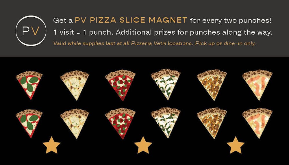 Every customer is eligible to receive one punch card when dining at PV on or after 9/14/2023. Every punch card has 12 pizza slices. 1 visit to PV= 1 pizza punch. Every 2 visits to PV = 1 pizza slice magnet.